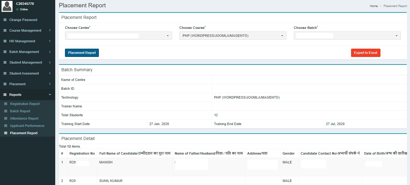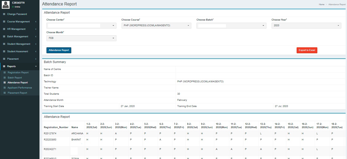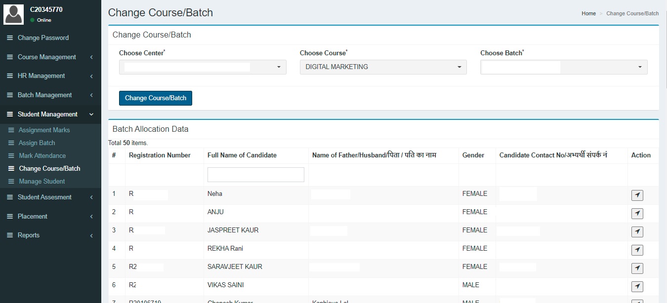 Upload student data in bulk and allocate training and batches. View available training types and batch allocation for the students.